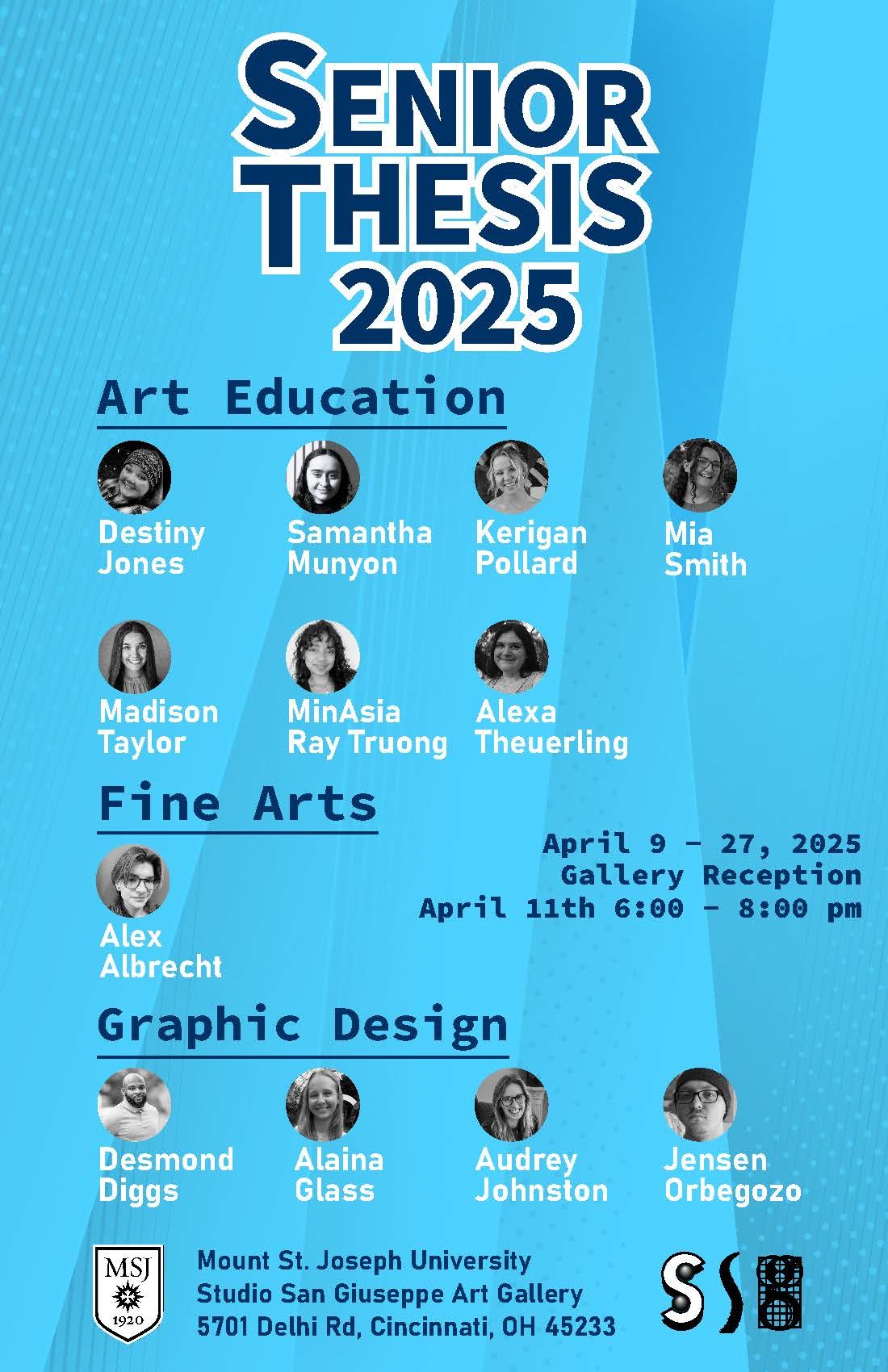 This is your Senior Thesis Exhibition invitation to the Gallery Reception on April 11th, 2025, from 6:00-8:00 pm. This is our time to congratulate and celebrate our students. We have 12 students who will be exhibiting their artistic work. The individual collections reflect over a year’s worth of creating from concept to production. Their work will be on display April 9th – April 27th, 2025, at Studio San Giuseppe Art Gallery.